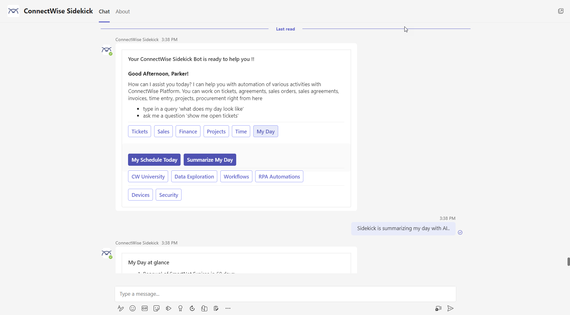 Use an AI-driven conversational AI bot in Microsoft Teams that interfaces with your ConnectWise PSA and generates insights that augment the ability of every function in your organization.
