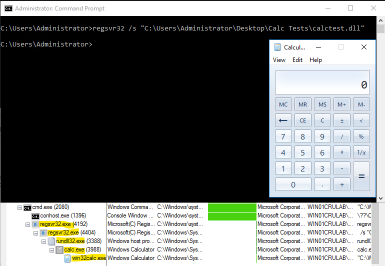 When observing our lab activity, you can see that we’re using Regsvr32 to silently load our calc test DLL. This silent approach ensures that no noticeable message boxes or alerts pop up, making the process discreet and less likely to alert the user to the potential malicious activity that is occurring. In a real-world threat scenario, an attacker might use this technique to quietly load and execute malicious code embedded within a DLL.