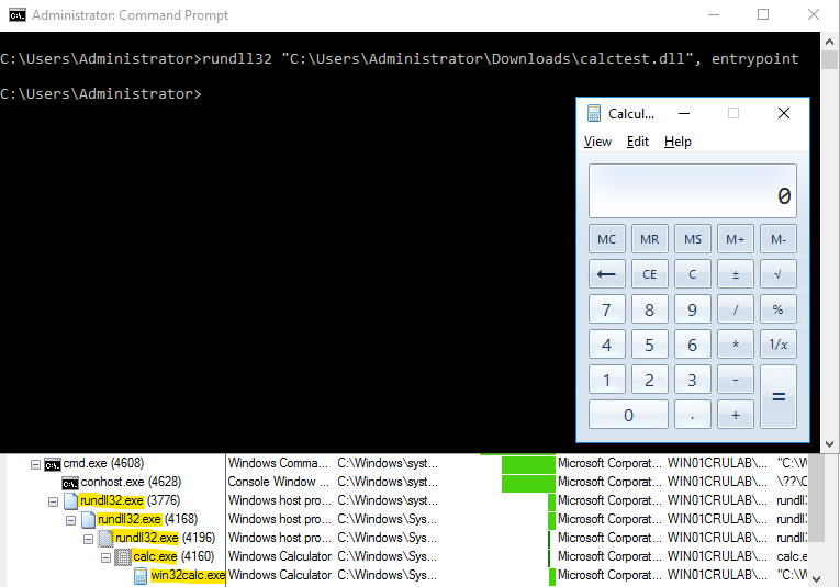In the lab activity above, you can see that we used Rundll32 to run our custom DLL with the argument “entrypoint,” which refers to a specific function within the calctest.dll that Rundll32 is being directed to call and execute.